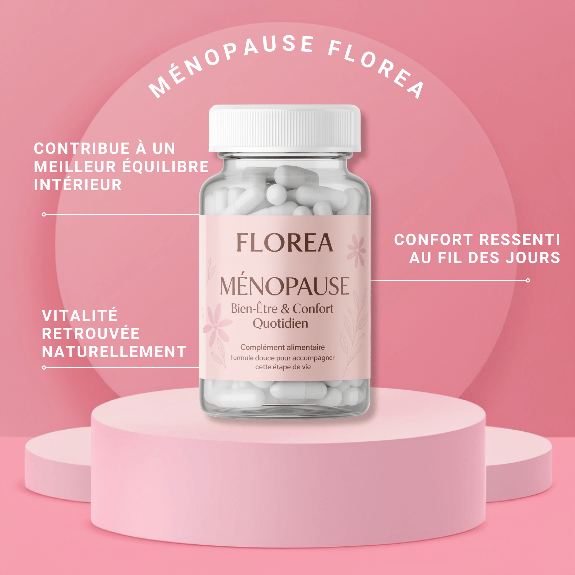 Florea Ménopause vous accompagne avec une formule douce, enrichie en vitamines et actifs ciblés pour favoriser un meilleur équilibre émotionnel, soutenir la vitalité et encourager une sensation de confort au fil des jours.
